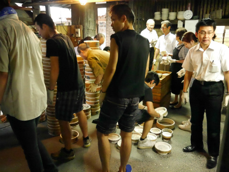 十四代と職人と事務職員も加わり、窯上りを確かめながら作業する。