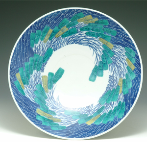 十三代今右衛門は若い頃前衛的な制作をしていたが、40歳頃から、伝統的な仕事の中で現代の色鍋島を追求していく作風へと変化する。特に、十三代は江戸期の色鍋島の文様の中でも、色絵房文皿(七寸皿)の円周上に周る現代的な、力強い構図に興味をひかれたようである。若い頃は麦、かるかや、すすき、露草を、十三代襲名後も紫蘭、玉すだれ、草花文、珠樹文など、生涯を通してこの構図を基として作品を造り続けている。 この作品も40歳代前半の作品であり、試行錯誤の中で創り上げたものと思える。 (文・14代今泉今右衛門)